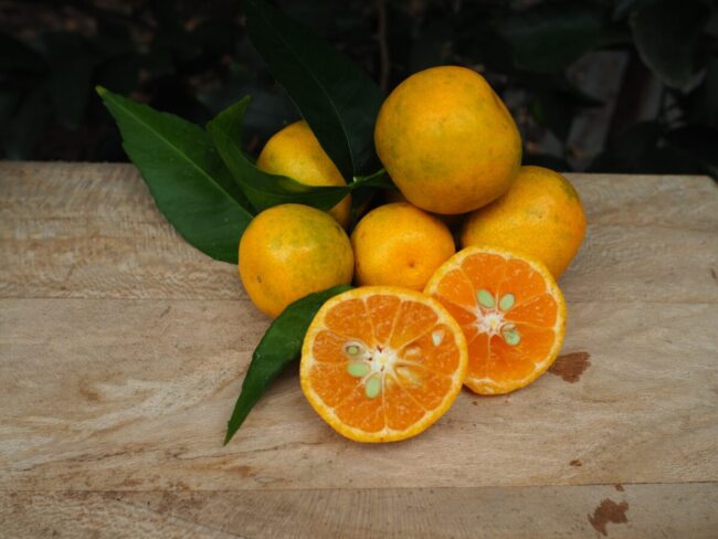 Le fruit est une petite clémentine orange  (50/60g env.), à peau fine, présentant un bel équilibre acide/sucre à maturité. Elle s’adoucira doucement au fil des semaines. La chair est orange, très aromatique et juteuse présentant quelques pépins.