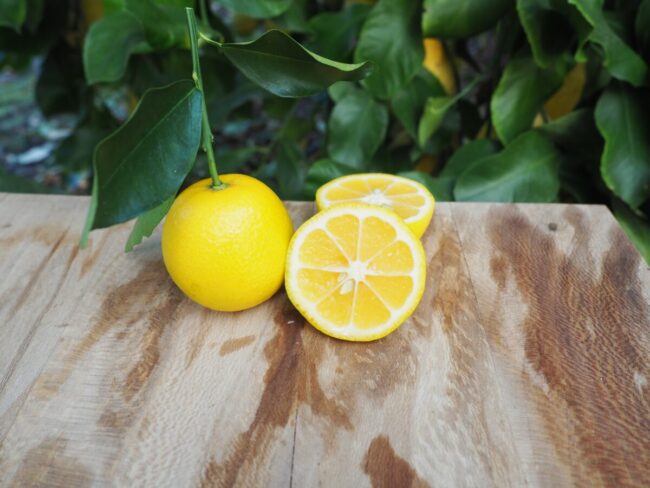 Le fruit ressemble visuellement à un limequat. La peau est très aromatique à l’image d’un kumquat. La chair présente peu de pépin et rappelle celle du citron meyer, avec un pointe d’acidité mais une belle rondeur. Un fruit délicieux.